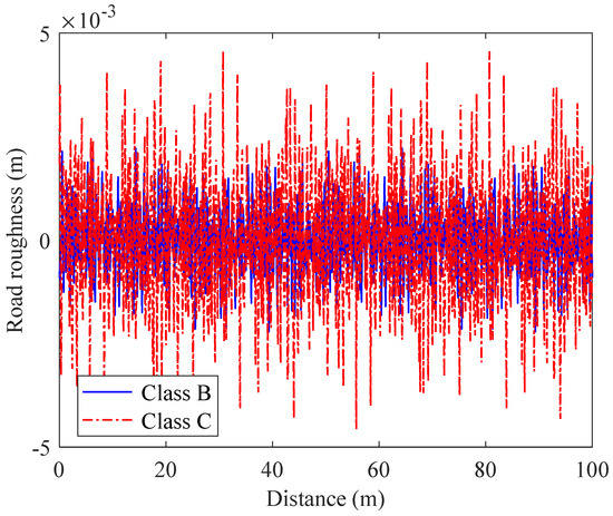 Using the simulation method outlined in the ISO 8606 specification, random road roughness samples for Grades B and C were generated, as illustrated in Figure 8. It becomes evident that pavement classes B and C possess greater amplitudes and higher frequencies in comparison to Class A. Figure 9 showcases a comparison of the moving force identification results at various pavement roughness levels. It can be observed that the vehicle–bridge contact force gradually rises with the increasing road surface grade. Notwithstanding the heightened roughness of classes B and C, the moving load identification employing the proposed method remains consistent with the real one. The RMSE values for Grades B and C stand at 0.1380 and 0.1384, respectively. Comparatively, the identified accuracy for these cases is slightly reduced compared to the result for Grade A, as depicted in Section 6, yet continues to present high precision. Consequently, the proposed method exhibits minimal susceptibility to road roughness in identifying the moving load. Furthermore, higher pavement grades lead to a more significant acceleration response, favouring the identification of the moving contact force.