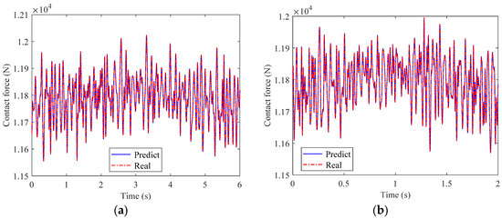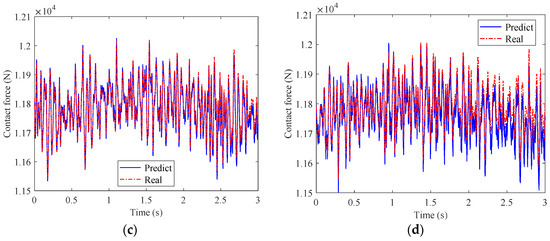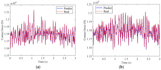 where and denote the predicted and real contact forces at time step i, respectively, and n stands for the total number of time steps. As derived from the definition of the RMSE, the value is smaller, while the predicted accuracy is higher for the proposed method.