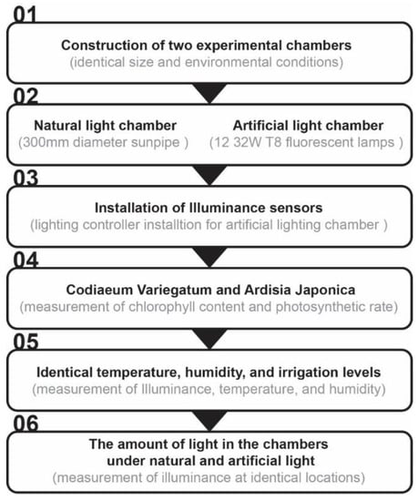 - To objectively assess the impact of natural and artificial light on plants, two experimental chambers of identical size and environmental conditions were constructed; in each, two plants were inserted, one Codiaeum variegatum and one Ardisia japonica [40].