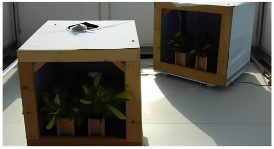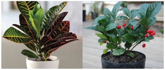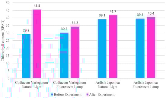 - Two plant species, Codiaeum variegatum of 110 cm and Ardisia japonica of 80 cm, were chosen for the experiment [44,45,46,47]. The plants were purchased from a local market. After a one-month acclimatization process to stabilize the growth status of the plants, the chlorophyll content and photosynthetic rate were measured following a two-week experimental period under each chamber’s conditions [48]. The growth response was subsequently assessed.