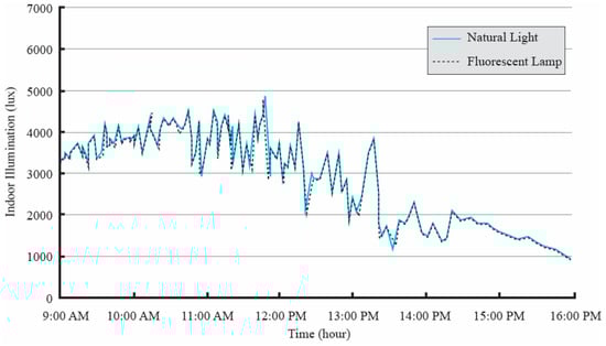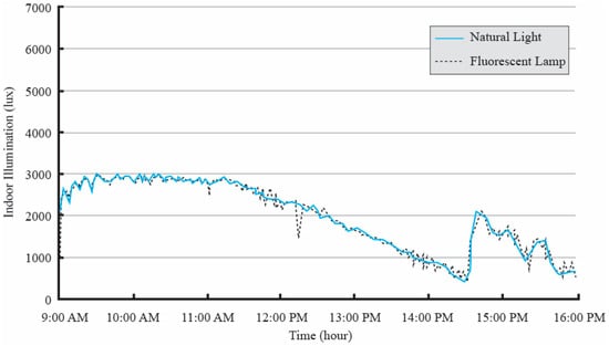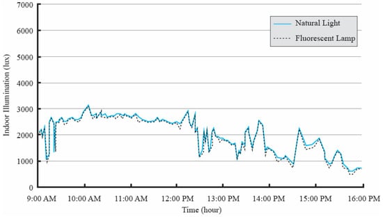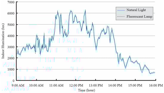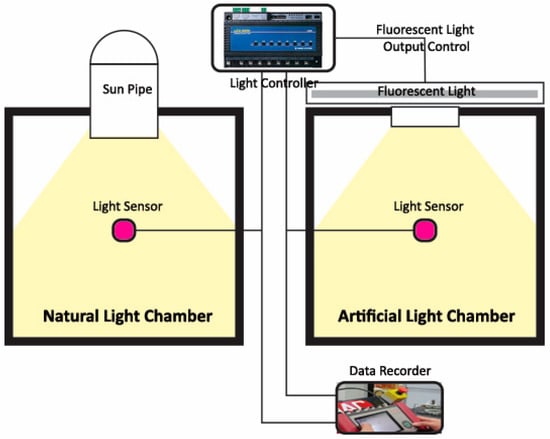 - In the natural light chamber, a 300 mm-diameter sun-pipe (a light duct-type natural lighting system) was installed by Monodraft of England [41]. Meanwhile, twelve 32 W T8 fluorescent lamps were fitted in the artificial lighting chamber with a color temperature, or correlated color temperature (CCT), of 4500 K, and a color rendering index (CRI) of 85.