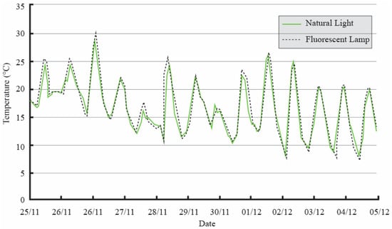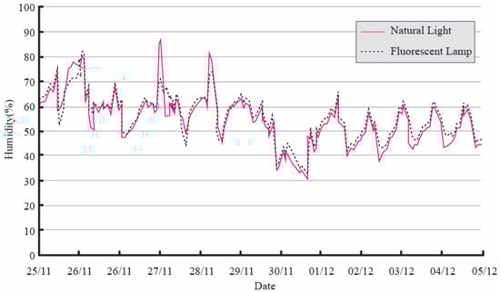 - Identical temperature, humidity, and irrigation levels were maintained throughout the experiment to eliminate factors affecting plant growth [49]. The illuminance, temperature, and humidity in each chamber were continuously measured; an average illuminance of 2200–6200–1000 lux, an average temperature of 18–27–7 °C, and a humidity of 60–85–40% were maintained throughout the experiment, as detailed below in the results.