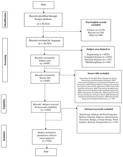 To comprehensively identify relevant publications pertaining to facilities management, several keywords were applied in the search. These keywords included “facilities management”, “building management”, “asset management”, “facility management”, “building maintenance”, “operation and maintenance”, “O&M”, and “O and M”. The reason for using general keywords was multiple-fold, including (1) the objective of this research was to identify various applications of these technologies in facilities management, (2) most of the literature includes specific facility zones and our selected keywords, and (3) since the application of these technologies spread to include various zones of asset management and decision making, it might not be possible to include all these zones. Given this, the keywords were selected in the literature search. All related literature was retrieved by searching within the title, abstract, and keywords sections. The search was performed in January 2023 with a date range set from 2012, providing a sufficient study period to analyze all state-of-the-art technologies. This resulted in the identification of 30,522 documents, with only 28,763 of them being in English.