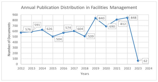 Figure 2 represents the annual distribution of publications around technology and smart advancements in facilities management over the last ten years. From the figure, it was noticed that before 2018, the number of publications fluctuated between a minimum of 504 and a maximum of 626. However, going from 2019 until 2022, there was a high growth that averaged almost 800 publications per year, which is about 200 publications higher than the average of the years before. Thus, the figure indicates that research efforts are expanding lately towards adopting more technological solutions to advance and improve facilities management performance. This can be assumed to be a result of the growing attention to expanding the benefits of Building Information Modeling (BIM) beyond the construction phase. Additionally, the emergence of new technologies such as DT and the new upcoming technology of blockchain resulted in increasing researchers’ interest in integrating and utilizing innovative solutions to produce smarter maintenance systems.