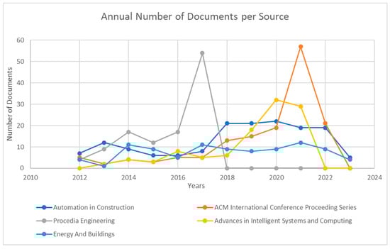 Based on the retrieved dataset, Table 13 displays the source titles and the number of documents published by the ten most relevant sources. In addition, Figure 5 presents the number of publications per year for the top five sources. As shown in the table and figure, the Automation in Construction journal ranks number one for having the greatest number of documents published since 2012, with a total of 155 publications. Moreover, it was noticed that the journal had a large increase in publications after 2017, reaching double the numbers of the years before. Furthermore, for the second most relevant source, ACM with their International Conference Proceeding Series (ICPS) had a very close number to the first journal with 149 documents, where their number of documents sparked after 2017, reaching 57 publications in the year 2021 alone. Thus, this emphasizes the expanded attention in the technological field of facilities and asset management in recent years. Procedia Engineering, with 113 documents since 2012, ranked as the third most relevant source on the list. This journal had 54 documents published in 2017, which is one of the highest numbers per year, as shown in Figure 5. However, this journal had no publications retrieved after 2017, as its latest issue was in 2018. Advances in Intelligent Systems and Computing is another source that showed an increase in the number of publications lately, where its numbers increased from 8 documents in 2016 to 32 in 2020. Thus, this journal, with 107 documents since 2012, ranked number four in the table. For the last journal presented in the figure, Energy And Buildings is the only source among the five that did not display any significant change throughout the years, as its numbers kept fluctuating without a steady trend. Nevertheless, this journal held a fifth place on the list with a total of 92 documents.