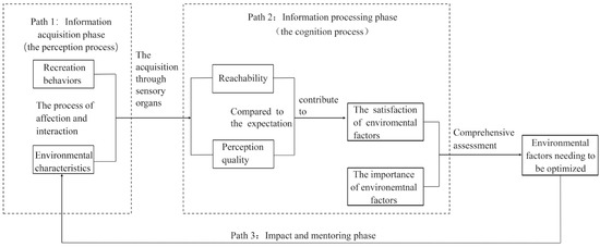 Gold and Burnett, respectively, have explained the process of environmental perception from a psychological point of view [19,20]. With comprehensive reference to previous theories, this paper interprets the environmental perception process. In the process of influence and interaction between recreational behavior and environmental characteristics, with information such as the accessibility and perceptual quality of the site obtained through perceptual organs, site users compare what they obtain with their expected environment [5], then stimulate the psychological perception activities in the brain, and produce the satisfaction of each environmental perception factor. Then, the users superimpose satisfaction with the importance of perception factors and comprehensively evaluate the environmental factors that need to be optimized on the site. This environmental perception process is therefore referred to in the influencing and guiding the optimization of the overall environmental characteristics of the site [7,19,21,22]. Therefore, the process of environmental perception can be divided into three stages: obtaining information, processing information, and influencing and guiding (Figure 1).