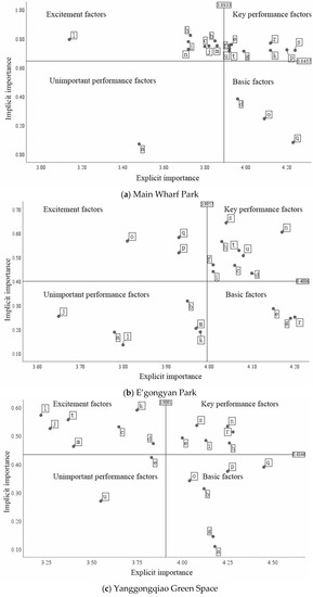 The value of implicit importance is obtained from the bivariate correlation analysis coefficient between the actual performance of perception factors and the overall satisfaction of perception factors [39], which can more accurately reflect the influence degree of environmental perception factors on the overall satisfaction. When the correlation coefficient between the performance value of environmental perception factors and overall satisfaction of perception factors is high, the implicit importance is relatively high, and vice versa [13]. It can be seen from Table 5 that there are significant differences in the implicit importance ranking of each perception factor of the three underpass green spaces, for example, the distribution and quantity of sports facilities and the effect of noise reduction and sound insulation have higher implicit importance in E’gongyan Park and Yanggongqiao Green Space, and those of Main Wharf Park are centered. Ornamental of vegetation ranks first in the implicit importance of Yanggongqiao Green Space, but ranks lower in that of Main Wharf Park and E’gongyan Park.