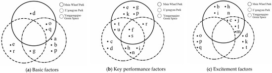 According to the explicit and implicit importance, an analysis grid map on IPA-Kano model was constructed (Figure 8), and based on the similarity and difference of visitors’ perception of the environment of three underpass green spaces, a three-factor analysis diagram including basic factors, key performance factors and excitement factors is classified (Figure 9).
