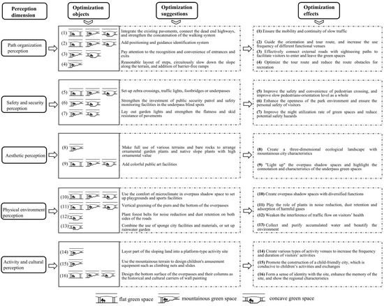 In addition to the existing sites, facilities and landscape resources, the particularity of the underpass environment and the terrain types are also important reasons that lead to the different test results of the three underpass green spaces. Based on the three factors of environmental perception factors and the results of the priority ranking of factors needing to be optimized, in order to improve the service quality and recreation satisfaction of underpass green spaces, the optimization suggestions of the service function of underpass green spaces are put forward, aiming at three terrain types of mountainous cities, from five perception dimensions (Figure 10). The first is the path organization, in terms of external accessibility, underpass green spaces mainly serve the residents of nearby communities. Regarding the visibility and convenience of entrances and exits, the three underpass green spaces are all surrounded by a dense road network and have a variety of surrounding land types. Main Wharf Park has a flat topography and the main pedestrian entrances and exits are located under the bridge, making it the best in terms of external accessibility; Yanggongqiao Green Space has a certain height difference from the surrounding roads, but it has more pedestrian entrances and exits in the underground passages, making it the second most accessible; The two main pedestrian entrances and exits of E’gongyan Park, which are only 1.5 m wide, are located on the overpass, and visitors have to walk down about 16 m of steps to reach this green space. Visibility and convenience are weak, and external accessibility is the worst, but people living under the bridge and visitors arriving from riverside roads can enter the green space more easily through the entrance under the bridge. The time to reach the green space is the basic factor of Yanggongqiao Green Space. The nearby communities of Yanggongqiao Green Space lack activity venues but there are a large number of middle-aged and elderly people living there. Consequently, the surrounding “capillary” traffic network should be diverted to ensure the smoothness and continuousness of slow traffic, and shorten the arrival time of residents as much as possible. The underpass green spaces in mountainous cities are more richly layered because their sites and spaces are separated by various types of terrain, overpass surface and underpass spatial structure, such as piers. In terms of internal accessibility, while flat underpass green space has flat terrain and wide sight, it is still necessary to add positioning and guiding signs to guide citizens who are unfamiliar with the tour path, and increase the frequency use of different functional venues; on account of the complex terrain and low direction recognition, the recognition and convenience of entrances and exits in addition to clear tour guide signs should be paid special attention to among the mountainous green spaces and concave green space. However, the mountainous underpass green space has large vertical height differences. So, on the premise of satisfying ergonomics, multiple measures could be taken, such as reasonable layout of steps, circuitous slowing of slopes along terrain, and addition of barrier-free ramps to make the tour route more convenient. In the meantime, hurdles should be removed for the elderly and children to increase the internal accessibility of underpass green space for all age groups.