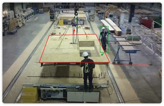 Potential hazard in a modular construction facility. The board in the red bounding box is guided in the direction of the red arrow, while the worker in the green bounding box is moving in the direction of the green arrow. Life-threatening contact collision may occur when the worker in the red bounding box is focusing on their allocated task and fails to recognize the proximity of the moving roof.