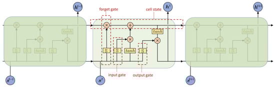 where are the corresponding weight and bias for each gate, and , , and represent input gate, forget gate, and output gate, respectively; is the cell state, and collects all information to the cell state. For simplicity, let collect all the weights and bias; that is,