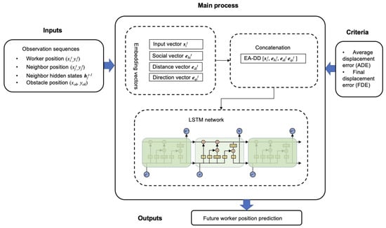Overview of our EA-DD worker trajectory prediction model. The model takes as input the primary worker’s position, neighbor’s position, neighbor’s hidden states, and obstacles’ position. By embedding individual movement-related vectors as well as the environment information vectors, the EA-DD model generates its output in the future position of the primary worker. The prediction performance is evaluated by ADE and FDE.