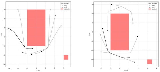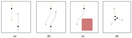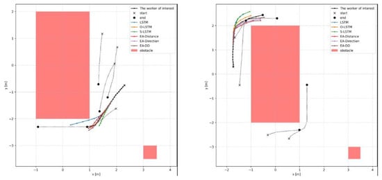We first verify our proposed model on a synthetic dataset. The dataset is generated according to a collision avoidance approach called optimal reciprocal collision avoidance (ORCA) [], which offers sufficient conditions for multiple independent agents making collision-free movements in a common workspace without communication with each other. In this synthetic dataset which is available on github https://github.com/Rachelmy/EA-DD (accessed on 10 August 2022)), a total of 1000 scenes were generated for five workers as well as two obstacles. The trajectories reflect various worker-to-worker interactions as well as environment-to-worker interactions, including (i) crossing each other, (ii) worker collision avoidance, (iii) obstacle collision avoidance, and (iv) dispersing; see Figure 5 for example scenarios. The vertices of two obstacles are (−1, −2), (1, −2), (1, 2), (−1, 2), and (3, −3.5), (3.5, −3.5), (3.5, −3), (3, −3), respectively. Regarding the center position as the position of an obstacle, we obtain the spatial coordinates of two obstacles, i.e., and ; see Figure 6 for the illustration of the synthetically generated samples and obstacles.
