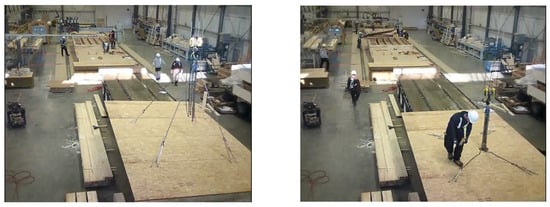 Among various factors that directly and indirectly contribute to fatalities and injuries in modular construction, contact collision, resulting from the proximity of construction resources (i.e., workers, equipment, and materials), is one of the most apparent aspects [,]. Due to a lack of proper object coordination and solid planning, the congested modular construction gives rise to potential hazardous contact collisions and even life-threatening scenarios. Figure 1 illustrates the potential hazard in a modular construction facility. In this context, it is critical to monitor the worker’s position in a timely manner and provide a warning to the involved workers before any potential stuck-by accident occurs.