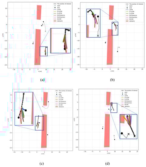 Prediction performance of different models in a bird’s-eye view on construction dataset. (a) trajectory prediction performance of the interested worker without being influenced by neighbors and static elements, (b) worker’s trajectory influenced by a neighbor, (c) the prediction of another worker’s trajectory, (d) trajectory prediction performance of a worker proceeding into an obstacle.