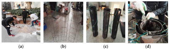 Prefabrication of model device. (a) Mixing of surrounding rock materials; (b) Model tunnel steel wire mesh layout; (c) Insulation layer and sensor layout; (d) Concrete pouring.
