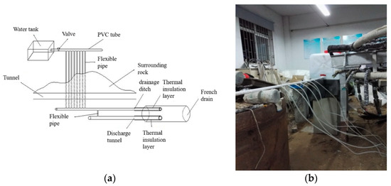 In the experiment, PVC pipes were utilized to represent the central drainage ditch and the cold-proof drainage hole, which were connected by an 8 mm hose. An 8 mm hose was used to connect the two. A water tank was positioned at a certain distance above the top of the tunnel, and the outlet of the water tank was connected to the PVC pipe. A drainage valve was installed on the PVC pipe to regulate the water flow by adjusting the valve. Figure 2 illustrates the layout of the drainage system.