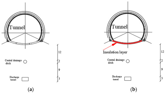 Insulation scheme for tunnel drainage structure. (a) Condition 1 (b) Condition 2.
