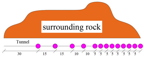 The longitudinal temperature sensors are arranged by defining the full length of the model tunnel as 1. The different depths of the cross-section are expressed as a percentage of the full length of the tunnel. For example, at a depth of 5 cm, it is represented as 1/60 of the full length of the tunnel. The same representation method is used for other cross-sectional positions.