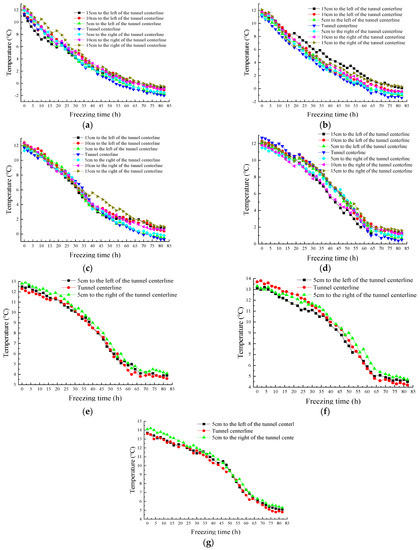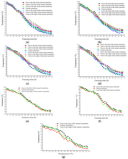 In Figure 14a–g shows the temperature variation curves at different depths of the tunnel at 5/13, 10/13, 16/13, 21/13, 28/13, 33/13, and 38/13 times the burial depth of the central drainage ditch.