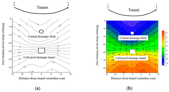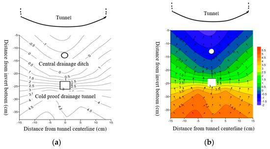 In Figure 11a–g is the temperature curve with freezing time at the buried depth of the central drainage ditch 5/13, 10/13, 16/13, 21/13, 28/13, 33/13, and 38/13 times, respectively. Figure 12 shows the temperature contour map and vector map of the tunnel cross-section.