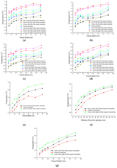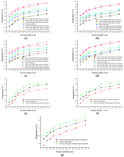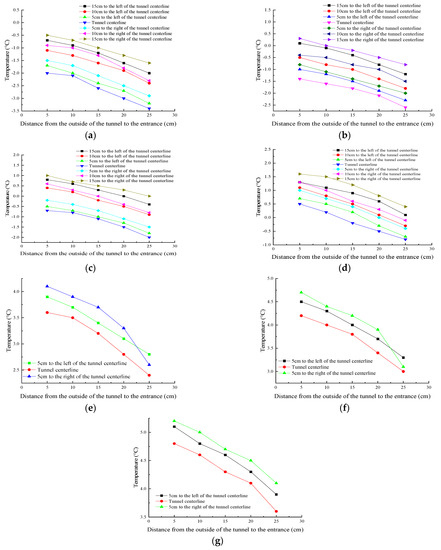 As shown in Figure 9a–g that the temperature change curves at different distances outside the tunnel entrance at depths of the central drainage ditch, which are 5/13, 10/13, 16/13, 21/13, 28/13, 33/13, and 38/13 times the depth of the central drainage ditch. As evident from the curve, the temperature is highest at a distance of 1/60 of the tunnel length from the tunnel entrance and gradually decreases as the distance from the tunnel entrance increases. The overall trend in temperature change shows a gradual decrease in temperature values with the increase in distance from the tunnel entrance. While the temperature of the lower surrounding rock gradually decreases as the distance from the tunnel entrance increases, the amplitude of temperature decrease is small. Compared to the temperature change inside the tunnel, the decrease is only slightly larger. For instance, taking the depth of the central drainage ditch at 5/13 times as an example, the temperature difference between measuring points at different depths at a distance of 1/60 and 1/12 of the tunnel length from the tunnel entrance is approximately between 1.1 °C and 1.5 °C. Moreover, the temperature value at the centerline position of the tunnel is the lowest, and the temperature gradually increases from the centerline position to both sides of the tunnel. The maximum temperature difference between the two sides of the tunnel and the centerline position is approximately between 1.4 °C and 1.8 °C.