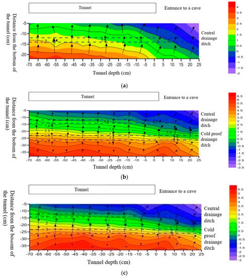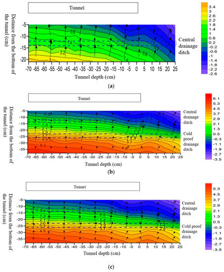 In other words, Figure 10b–d show that the temperature change trend along the axis is relatively consistent at a position 5 cm away from the centerline of the tunnel on both sides. As the tunnel depth decreases, the temperature gradually decreases from 7/30 of the tunnel length to 1/12 of the tunnel length outside the tunnel entrance. The highest temperature at this location appears at a depth of 7/30 of the tunnel length, while the lowest temperature appears at 1/12 of the tunnel length outside the tunnel entrance. Negative temperatures exist around the central drainage ditch, but the distribution of negative temperatures is slightly different. All measurement points around the anti-freeze drainage hole indicate positive temperatures. Therefore, it can be concluded that the temperature gradually decreases from the inside to the outside of the tunnel as the depth decreases.