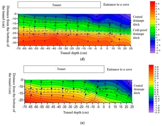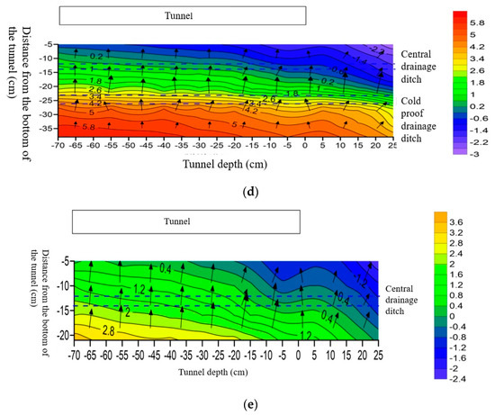 As shown in Figure 10a,e that the temperature change trend along the axis at a position of 10 cm on both sides of the tunnel centerline is relatively consistent. From a depth of 7/30 of the tunnel length to the tunnel entrance section, the temperature values at different depths below the tunnel arch decrease as the tunnel depth decreases. The temperature value outside the tunnel at a distance of 1/12 of the tunnel length from the tunnel entrance is the lowest. Negative temperatures are observed around the central drainage ditch from a depth of 5–10 cm along the tunnel axis.