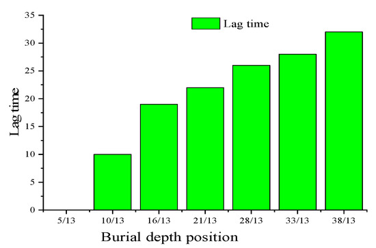 At a depth of 5/13 times the depth of the central drainage ditch, the minimum temperature value is −1.5 °C, while at a depth of 38/13 times the depth of the central drainage ditch, the minimum temperature value is 5.1 °C. As the depth increases, the minimum temperature inside the lower surrounding rock of the tunnel gradually increases, resulting in a temperature difference of about 6.5 °C within the test area. Figure 13 shows the lag time plots under different burial depths.