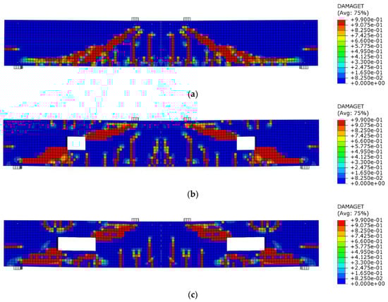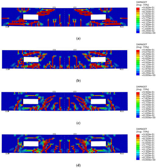The following section delves into the impact of different prestressing levels of Fe-SMA bars around the opening on the beams’ overall response. To prevent the manuscript from becoming excessively long, Figure 11 serves as an illustrative example by displaying only the cracking pattern of beams in group II. It can be noticed that the presence of the opening induces stress concentrations, leading to crack initiation near the corners of the opening. These initial cracks propagate in both vertical and diagonal directions, interacting with adjacent cracks and reinforcing bars. The crack propagation behavior depends on factors such as the opening size and prestressing level of Fe-SMA bars. Increasing the prestressing level of Fe-SMA bars in RC beams with openings offers a promising approach to mitigate crack localization and enhance structural integrity.