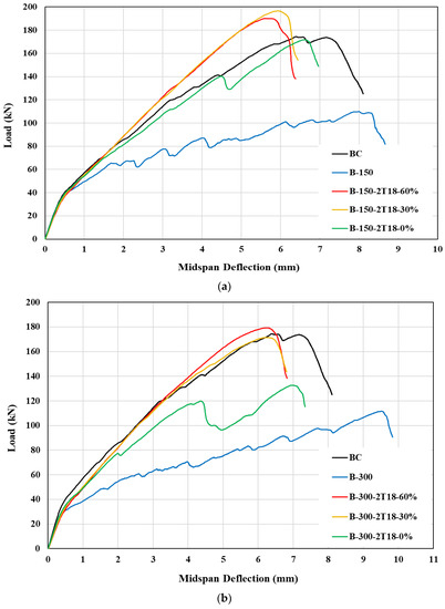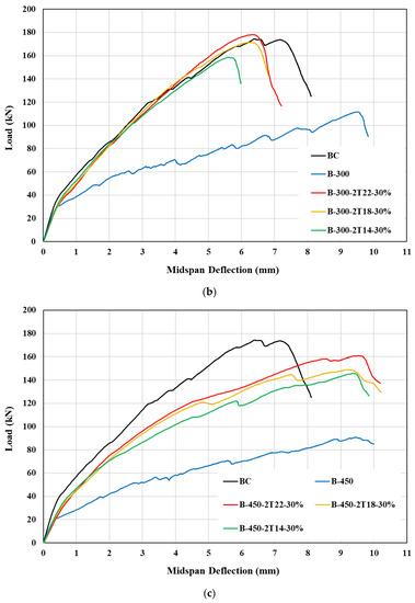 On the other hand, reinforcing the opening with unactivated 2T18 Fe-SMA bars had a minor positive impact on the behavior of beams with 300 mm and 450 mm opening lengths. Nevertheless, when the Fe-SMA bars were subjected to 30% and 60% prestressing levels, the shear capacity of beams with 300 mm and 450 mm opening lengths was fully and partially restored, respectively. Specifically, beams B-300-2T18-30% and B-300-2T18-60% showed similar load-deflection behavior to BC and reached capacities of 171.3 kN and 179.2 kN, respectively, which are very close to the BC capacity of 174.3 kN. On the other hand, beams B-450-2T18-30% and B-450-2T18-60% had ultimate loads of 148.8 kN and 167.2 kN, respectively, about 14% and 4% lower than that of BC. Furthermore, it was observed that increasing the prestressing level from 30% to 60% resulted in a slight improvement in the stiffness of the beams. These findings suggest that the proposed technique for enhancing shear strength is most effective for beams with small and medium web openings (i.e., 100 × 150 mm and 100 × 300 mm), as it can restore both shear strength and stiffness. However, for beams with larger web openings of 100 × 450 mm, the use of activated Fe-SMA beams enabled recovery of almost 90% of the solid beam’s shear, as demonstrated in Figure 13.