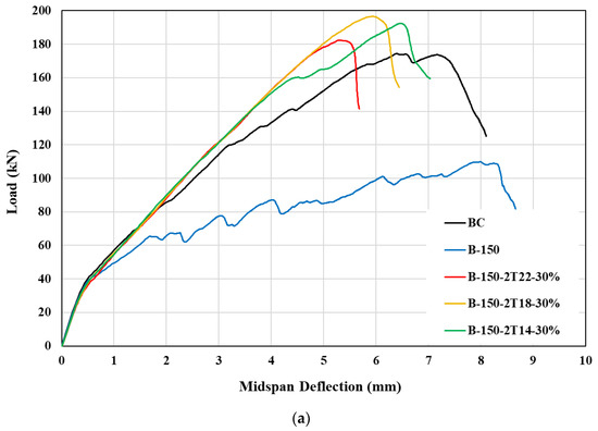 This section investigates the effect of the Fe-SMA reinforcement ratio on the load-deflection response of beams with web openings. The current section examines three different Fe-SMA diameters (14, 18, and 22 mm), while keeping the prestressing level constant at 30%. The beams are split into three groups, IV, V, and VI, with varying opening lengths of 150, 300, and 450 mm, respectively. Figure 14 shows the cracking patterns for beams in group V. It can be noticed that increasing the Fe-SMA reinforcement ratio slightly mitigates crack localization in RC beams with openings. Table 6 summarizes the numerical results of groups IV, V, and VI. The findings from group IV demonstrate that reinforcing the small openings (100 × 150 mm) with Fe-SMA bars of different diameters (14, 18, and 22 mm) can enhance the beam’s shear capacity and stiffness compared to the solid beam (BC), as shown in Figure 15. Similarly, using pre-stressed Fe-SMA bars to strengthen the opening area can recover the shear capacity and stiffness of a medium-sized opening beam (100 × 300 mm) compared to the BC. However, one exception was observed in group V, where the beam strengthened with 2T14 mm Fe-SMA bars exhibited a 9% lower ultimate load than the control beam, while it showed 42% higher strength than the beam with unstrengthened openings, as demonstrated in Figure 16.