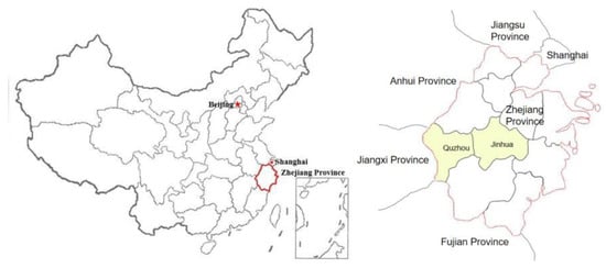 This study focuses on the rural traditional houses located in Jinhua and Quzhou, China. Both Jinhua and Quzhou are situated in the Jinqu basin, which lies in the western region of Zhejiang. The Jinqu basin is a strip-shaped area with an east–west trend, and its latitude, landform, hydrology, and climate are quite similar (Figure 1). Thus, the constructed “socio-spatial” relationship is more reliable since natural variables are eliminated.