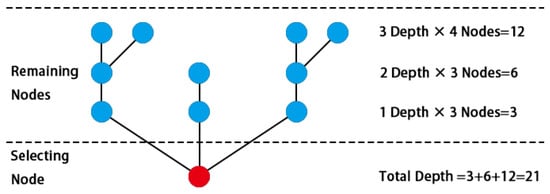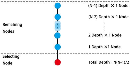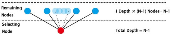 The RA value assesses the interrelation between the selected spatial node and the other nodes. The selected node serves as the reference point, and the average number of steps from the other nodes to the reference point, known as the mean depth (MD), is calculated. The MD reflects the efficiency of reaching other system parts from the selected node. When the MD is 1, regardless of whether from the reference point to other nodes or from other nodes back to the reference point, the depth is 1, indicating symmetry (Figure 2). Generally, the reference point and the remaining system are asymmetric (Figure 3). In the most extreme case, the MD equals N/2 (Figure 4). To better compare this asymmetry, spatial syntax mathematically converts the MD into the RA. The RA value ranges from 0 to 1. A higher RA value indicates lower interaction efficiency between the selected reference point and the rest of the system. In residential buildings, nodes with higher RA values are less easily reached.