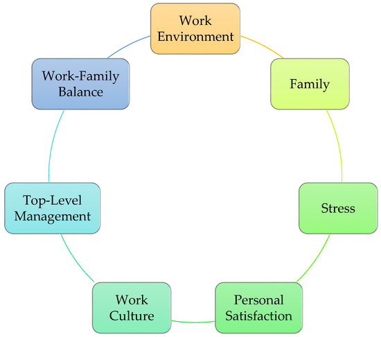 Finally, the work–family balance was positively correlated with work culture (R = 0.181) at the 5% significance level. This study found that the work culture was not significantly correlated with the work environment, family, stress, personal satisfaction, or top-level acceptance.