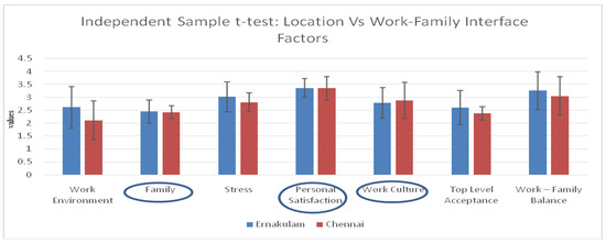 From the results in Figure 3, it was made clear that the male and female respondents of the study differed significantly with respect to the mean rating for the factors work environment (t = 0.003, and p = 0.000), stress (t = 3.062, and p = 0.003), top-level acceptance (t = 3.035, and p = 0.003), and work–family balance (t = 1.981, and p = 0.049). However, the present study did not identify any significant differences in the mean score between employees working in Chennai and Ernakulum for factors, such as family, personal satisfaction, and work culture. Therefore, H1 is supported for the factors family, personal satisfaction, and work culture, but rejected for the factors work environment (1% level), stress (1% level), top-level acceptance (1% level), and work–family balance (5% level). Family, personal satisfaction, and work culture play a vital role in the WFI, even when tested based on two different locations. The analysis shows that personal satisfaction is an essential factor, which can be related to the theory of needs [36]. The highest level of needs according to this theory is self-esteem, which is equivalent to personal satisfaction. Next came work culture, which can be understood through the doctrines of organizational culture; every organization possesses its own culture, which should be aligned to its own people’s culture. Another critical factor is the family, which is the basic element of any social set-up, and any behavioural shortcomings will have both direct and indirect effects on the family.