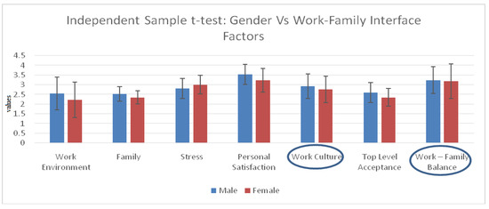 H2 was tested using independent sample t-tests with gender as the independent variable and the WFI factors as the dependent variables. Figure 4 showed that male and female respondents differed significantly in the mean rating for the factors work environment (t = 2.0978, and p = 0.032), family (t = 2.6681, and p = 0.008), stress (t = 2.23, and p = 0.023), personal satisfaction (t = 2.654, and p = 0.008), and top-level acceptance (t = 2.671, and p = 0.007). However, the present work has not identified any significant differences in the mean rating of male and female employees for the factors work culture and work–family balance. Therefore, H2 is accepted for the factors work culture and work–family balance but rejected for the factors work environment (5% level), family (1% level), stress (5% level), personal satisfaction (1% level), and top-level acceptance (1% level). Work culture and WLB play a critical role in both genders. During the study, it is also seen that some organisational work culture helps employees to spend more time with family. However, at certain times, professional life is affected by family commitments and concerns.
