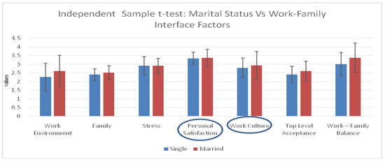 In Figure 5, it was clarified that the single and married respondents in the study differed significantly in the mean rating of factors, such as work environment (t = 2.635, and p = 0.010), family (t = 2.045, and p = 0.042), stress (t = 3.914, and p = 0.000), top-level acceptance (t = 2.7145, and p = 0.007), and balance (t = 3.281, and p = 0.001). However, the current study has failed to identify any significant change in the mean rating between single and married respondents for personal satisfaction and work culture. Therefore, H3 is accepted for the factors personal satisfaction and work culture but rejected for the factors work environment (5% level), family (5% level), stress (5% level), top-level acceptance (1% level), and work–family balance (1% level). Personal satisfaction does not play an important role in marital status, but the level of stress will be greater in the work culture of married people.
