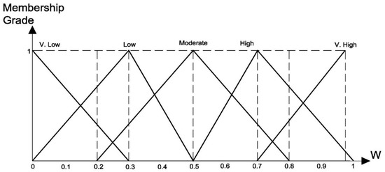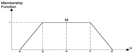 Previous studies have demonstrated that the fuzzy scale is more accurate than the conventional scale. Low, moderate, and high are the language phrases used in questionnaire replies to describe the data. These language concepts are converted into fuzzy values using the FLS so that fuzzy interference rules can be applied to them. After that, these fuzzy values are defuzzied to produce concrete values which are more precise and can be used in analysis. The adopted methodology was similar to the work in [51], where the trapezoidal distribution (a, b, c, d) can describe a fuzzy number (M) of the universe of discourse (U) as shown in Figure 2. The trapezoidal value is defuzzied into (e). The crisp value (e) can be estimated using Equation (2) [52].