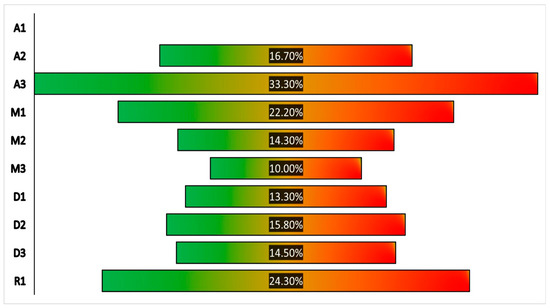 Also, the observable dimensions’ relative weights (WOj), are calculated using the ratio between the factor loading of each observable variable (FLj) and the summation of the factor loadings of observable dimensions (∑FLj), in the corresponding latent dimension, as in Equation (8). The values of the observable variable factor loadings and relative weights are presented in Table 9.