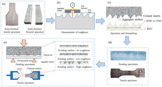 Analysis of bonding interface: (a) creating the roughness; (b) measuring the roughness; (c) diagram of the interface between two materials; (d) preparing specimens; (e) bending and tensile tests.