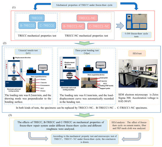 The research ideas of this paper are shown in Figure 3. The test is divided into three parts: 1, 2, and 3. The main test methods for the influence of freeze–thaw cycles on TRECC and TRECC-NC materials include: