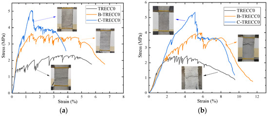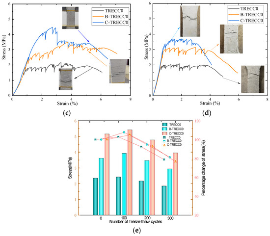 Figure 4 shows the stress–strain curves of TRECC0, B-TRECC0, and C-TRECC0 specimens under different freeze–thaw cycles.