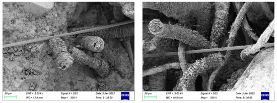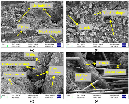 In order to further study the internal microstructure of the TRECC1-NC repair system under freeze–thaw cycles, SEM electron microscopy is employed to observe the typical failure modes. As shown in Figure 11a,b, the structure of hydration products of NC changes significantly under freeze–thaw cycles. NC is no longer a dense structure combined with gel and crystal but a loose structure interwoven with needles or rods, showing disorder. There are large pores in NC and bubbles in a completely closed state, and cracks gradually appear. After the fracture slip between the fiber and the cement-based material, a large quantity of the hydration products is still attached to the fiber (see Figure 11c). After the fiber is broken, dense cracks appear on it. Due to the test of the specimen in the saturated state, Ca(OH)2 will be produced in the gap between the fiber and the cement base, which seriously reduces the bonding strength between the two. However, the pozzolanic activity of fly ash results in the production of hydration products that reduce the production of Ca(OH)2 crystals and enhance the bonding between the fiber and the cement matrix [1]. As shown in Figure 11d, it can be observed that the FRP grid cloth has good bonding with the cement matrix, and the failure section of the FRP fiber bundle is broken, indicating that FRP plays a crucial role in the TRECC1-NC reinforcement system.