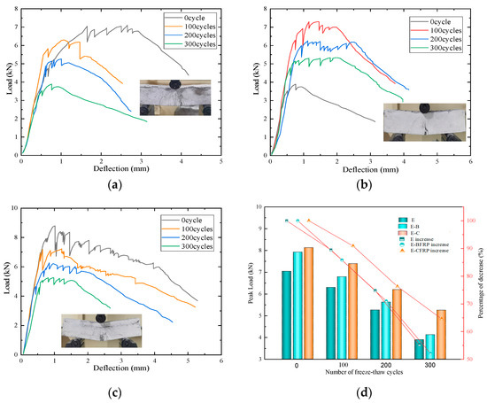 Load–deflection curve and comparison of the three-point bending test. (a) TRECC specimen; (b) B-TRECC1 specimen; (c) C-TRECC1 specimen; (d) ultimate bearing capacities of different specimens under freeze-thaw cycles.