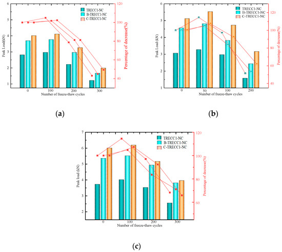 Without freeze–thaw cycles, the ultimate load of B-TRECC1 and C-TRECC1 specimens increases by 11.2% and 13.4%, respectively, compared with TRECC1 specimens. After 100 freeze–thaw cycles, the ultimate load of B-TRECC1 and C-TRECC1 specimens increases by 7.2% and 14.9%, respectively, compared with that of TRECC1 specimens under 0 freeze–thaw cycles. After 200 freeze–thaw cycles, the ultimate load of B-TRECC1 and C-TRECC1 specimens increases by 6.4% and 15.1%, respectively, compared with that of TRECC1 specimens under 0 freeze–thaw cycles. However, it decreases to the lowest after 300 freeze–thaw cycles, with an increase of 5.5% and 25.9%, respectively, compared with TRECC1 specimens under 0 freeze–thaw cycles.