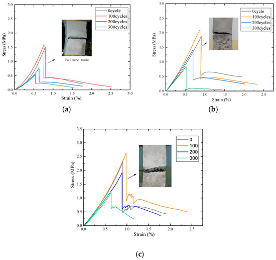 Figure 8 shows the changes of tensile strength and ultimate tensile strain of TRECC0-NC material after 0, 100, 200, and 300 freeze–thaw cycles. As shown in Figure 8a, the chemical reaction of cement paste on the surface of TRECC0-NC results in the formation of a weak transition zone at the interface. During repair, a water film is formed on the surface of the old concrete, leading to a higher local water–cement ratio of the new concrete at the bonding surface than the water–cement ratio of the system. This, in turn, increases the porosity at the bonding interface and reduces the interface strength. After reaching the ultimate load, the rebound of the strength curve exhibits a small rebound, and there is no obvious strain-hardening characteristic. After 0 freeze–thaw cycles, the ultimate bearing capacity is 1.49 MPa. With an increase in the number of freeze–thaw cycles, the ultimate bearing capacity of the specimen initially increases first and then decreases. The ultimate bearing capacity of the specimen reaches the maximum value of 1.6 MPa under 100 freeze–thaw cycles. After 100 freeze–thaw cycles, it begins to decline, and after 300 cycles it will reach the minimum of 0.54 MPa.