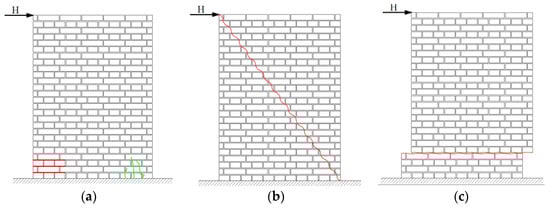 - Flexural failure (toe crushing or rocking): failure due to exceeding the compressive strength (vertical cracks—Figure 1a–green lines) at the compressed part of the cross-section. The failure is normally accompanied by the opening of a crack at the tensile side (horizontal cracks—Figure 1a–red lines). The failure mode is typical for slender walls with high compressive stress. In case compressive stress is low, a crack opens on the tensile side, but there is no crushing on the compressed side. Such a response is called rocking.