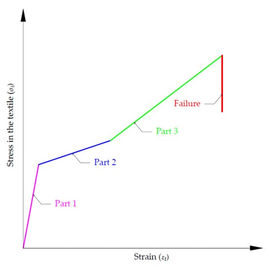 Since fibers with good tensile properties are embedded in the mortar matrix with poor tensile properties, the mortar cracks first, which activates the fibers [36]. The fibers carry tensile forces long after the initial cracking. This can be observed in uniaxial tensile tests conducted on prismatic (coupon) samples. By dividing the tensile force by the cross-sectional area of the fabric, the stress–strain curves of the FRCM are obtained [36], which can be idealized by a trilinear curve [36,37].