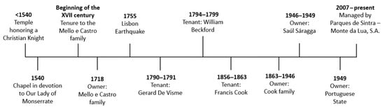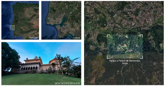 The Monserrate Palace belongs to the Cultural Landscape of Sintra (Figure 1), classified as a World Heritage Site by UNESCO since 1995, and is characterized by its unique identity and the progress of architecture and technology in landscape and project planning. These topics alone are an indication of its heritage value, emblematic identity and consequent relevance for the research and preservation of the palace and its surroundings.